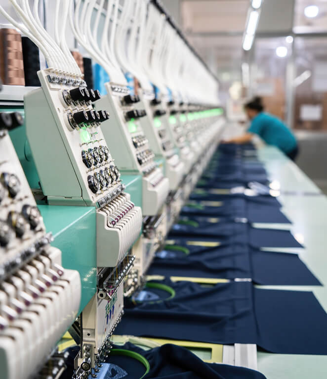 This is the assembly stage where cut fabric pieces are sewn together using various sewing machines and techniques to construct the final shape of the garment.